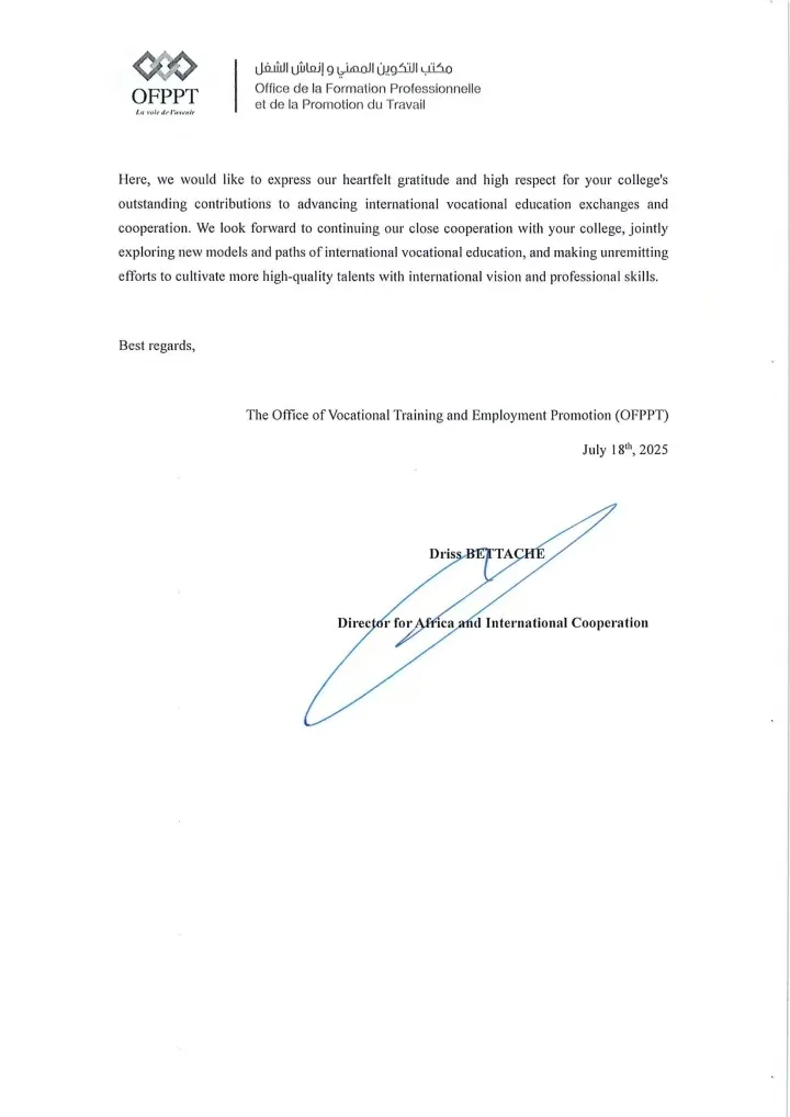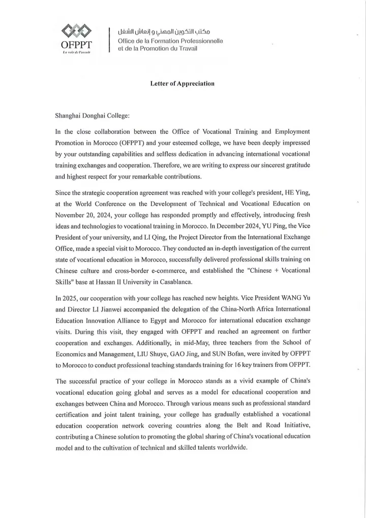 Recently, Morocco’s Office for Vocational Training and Employment Promotion (OFPPT) sent a letter to Shanghai Donghai College (SDC), highly commending the college for its remarkable achievements in advancing China-Morocco vocational education cooperation, as well as its professional competence, dedication and outstanding contributions.